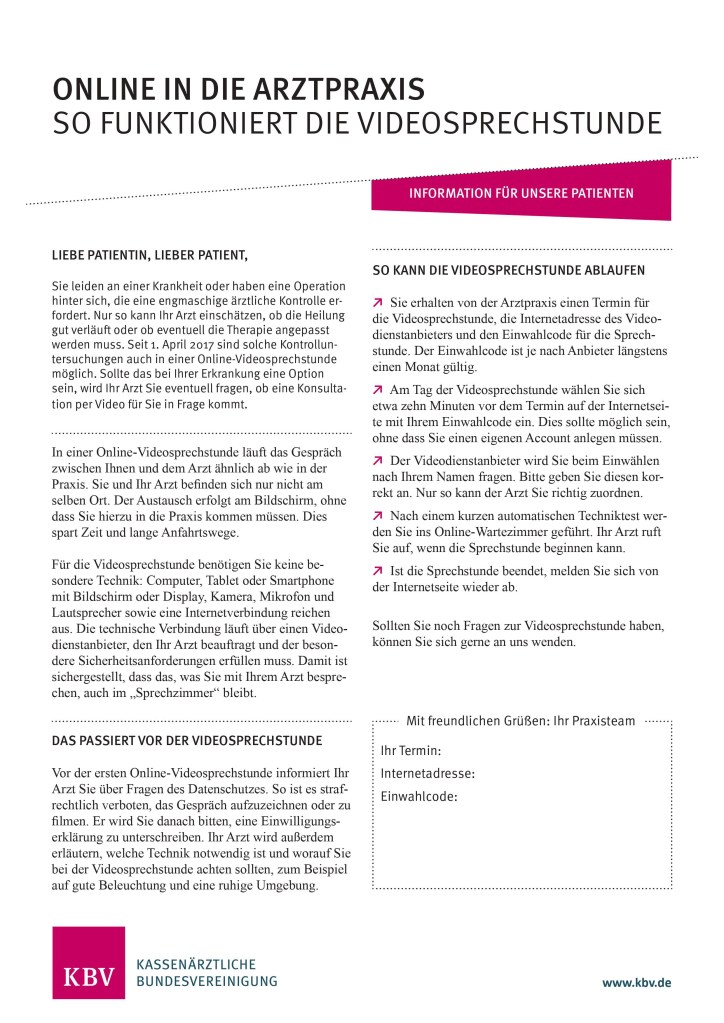 Aufgrund des bestehenden Infektionsrisikos empfiehlt die Kassenärztliche Bundesvereinigung Ärzte und Therapeuten nur noch bei dringendem Bedarf und im Optimalfall nach telefonischer Rücksprache aufzusuchen.